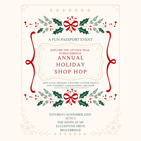 Enjoy a fun-filled day out and explore the UPTOWN TRAIL in beautiful Bracebridge. Participate in our one day HOLIDAY SHOP HOP event and warm up your November with the spark of friendship…