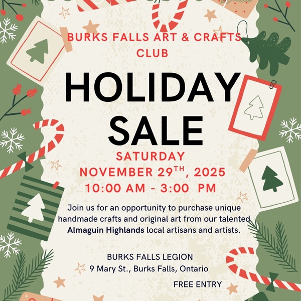 Join the Burk's Falls Arts & Crafts Club for their annual Holiday Sale on Saturday, November 29th from 10am-3pm. This event is an opportunity to purchase unique handmade crafts and original art…